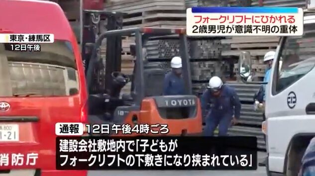 日テレNEWS NNN12日午後、東京・練馬区の建設会社の敷地で2歳の男の子がフォークリフトにひかれる事故がありました。男の子は意識不明の重体です。