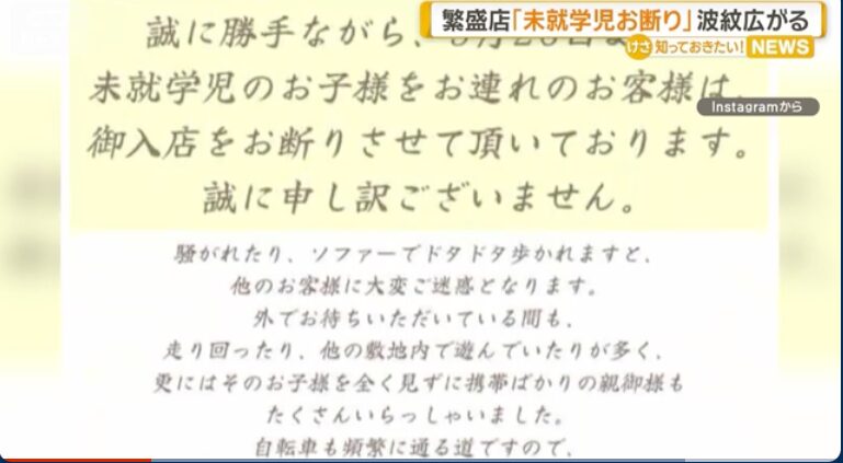 「誠に勝手ながら、未就学児のお子様をお連れのお客様は、ご入店をお断りさせて頂いております。誠に申し訳ございません」