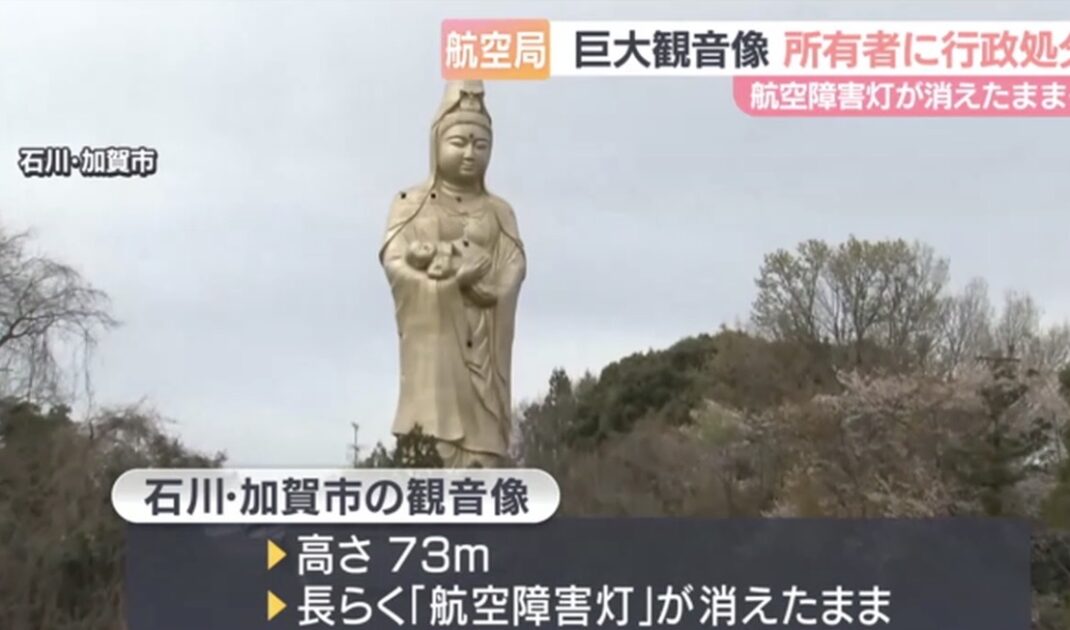 石川県の巨大観音像の所有者に行政処分が出ました。 大阪航空局によりますと、石川県加賀市にある高さ73メートルの観音像は、長らく航空障害灯が消えたままになっています。