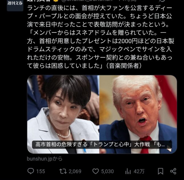引用元: ・高市早苗首相、大ファンのディープ・パープルに2000円の自分のサイン入りドラムスティックをプレゼントし困惑させる [バイト歴50年★]