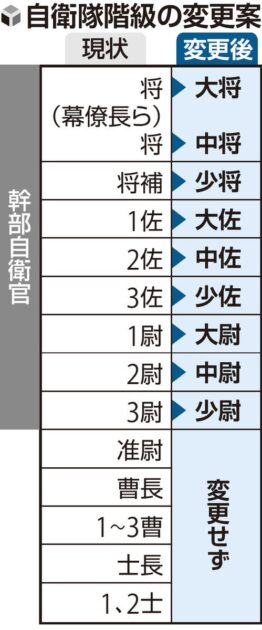 対象は「准尉」を除く尉官以上の幹部で、将補を「少将」、2佐を「中佐」、3佐を「少佐」、1尉を「大尉」などに変更する。数字の階級表記は、国民から1佐と2佐でどちらが高位なのか分かりにくいとの指摘が出ていた。
