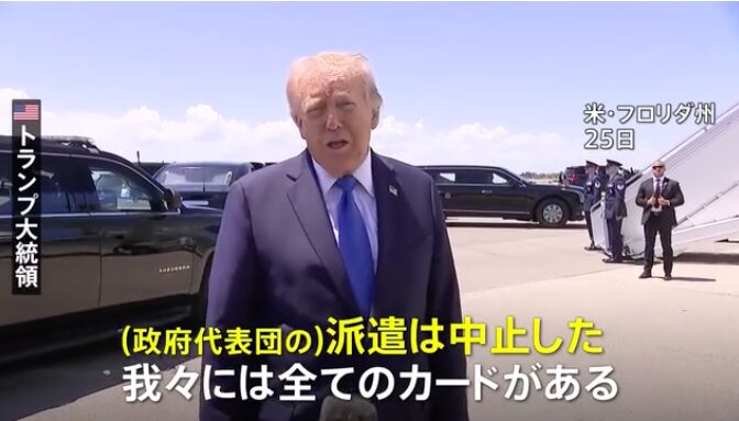 トランプ大統領は25日、イランとの協議のため、この日パキスタンへ出発するとしていた代表団について派遣を中止したと明らかにしました。「移動時間と費用がかかり過ぎる」と説明しています。