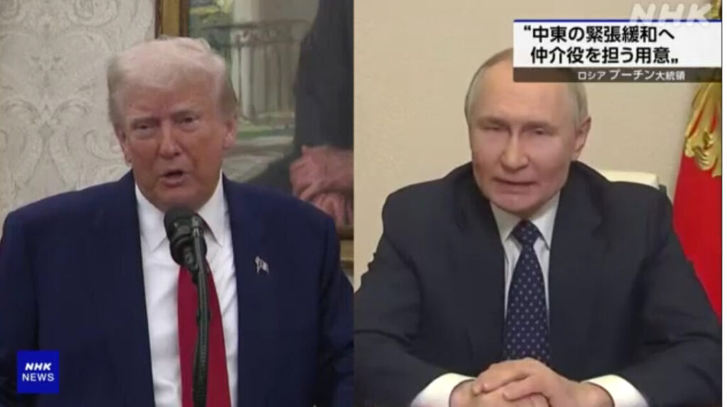 1: 蚤の市 ★ 2025/06/15(日) 10:14:46.37 ID:HPjt5Iu49 ロシアのプーチン大統領が14日、アメリカのトランプ大統領と電話で会談し、イスラエルによるイランへの攻撃を非難するとともに、緊張緩和のためロシアが仲介役を担う用意があると表明しました。ロシ... -