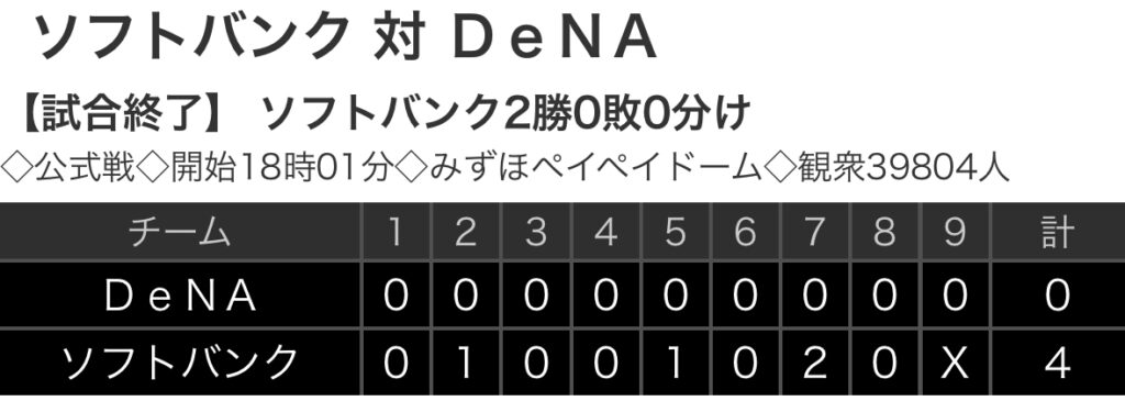 1: 鉄チーズ烏 ★ 2025/06/14(土) 20:54:05.29 ID:vHlKgL9T9 DeNA. 0 0 0 0 0 0 0 0 0 |0 ソフトバンク 0 1 0 0 1 0 2 0 x |4 【バッテリー】 (De)大貫、坂本、堀岡 - 戸柱 (ソ) 上沢、藤井、杉山 - 嶺井...