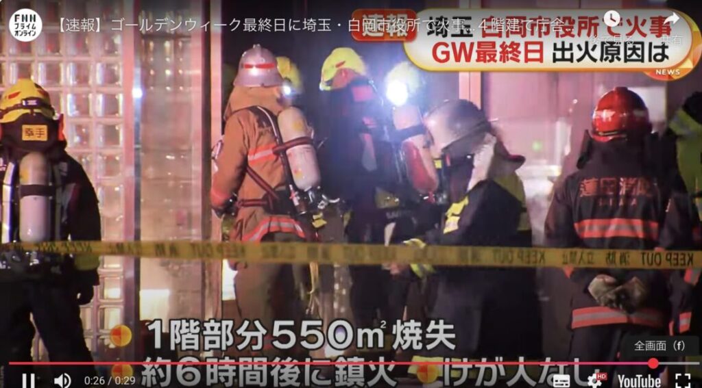 ゴールデンウィーク最終日に埼玉・白岡市役所で火事…4階建て庁舎の1階から白煙 550平方メートル焼き約6時間後消火