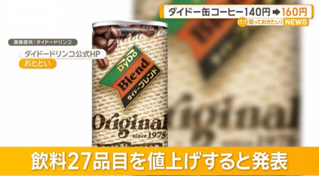 1: 名無しさん@涙目です。(東京都) [ヌコ] 2025/05/05(月) 16:09:12.77 ID:hCzHbaHa0● BE:837857943-PLT(17930) sssp://img.5ch.net/ico/u_utyuu.gif ダイドードリンコは、缶やペットボトルなどの飲料27品目を10月納品分から値上げすると発表しました。 対... -