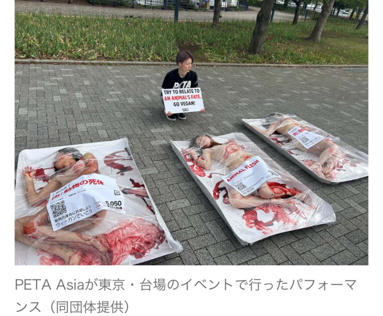 1: 鮎川 ★ 2025/05/05(月) 07:45:10.21 ID:??? TID:ayukawa 東京・台場で開かれている肉フェスの会場付近で行われたあるパフォーマンスがSNSで賛否を巻き起こしている。動画で配信されたのは血のりを塗った女性が肌をさらし「肉:動物の死体」とプリントさ... -