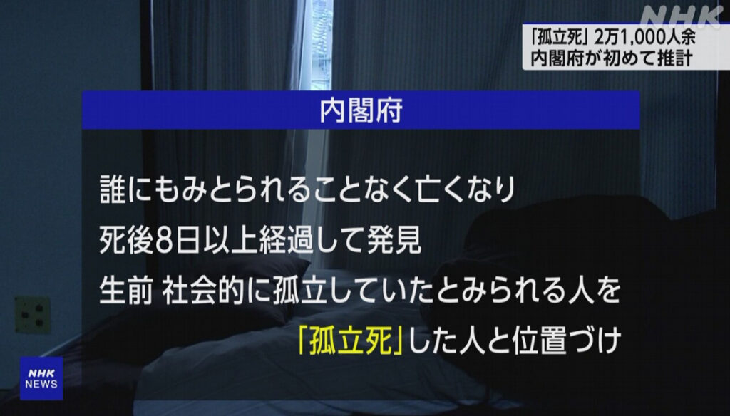1: 香味焙煎 ★ 2025/04/11(金) 05:14:22.79 ID:uw0eUKb89 孤独や孤立への対策をめぐり、内閣府が誰にもみとられることなく亡くなり生前、社会的に孤立していたとみられる人を「孤立死」した人と位置づけて初めて推計した結果、去年1年間に2万1000人余りい... -