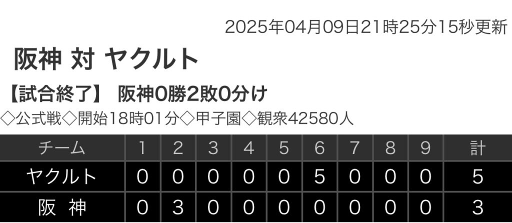1: 鉄チーズ烏 ★ 2025/04/09(水) 21:23:29.01 ID:213++Z8W9 ヤクルト 0 0 0 0 0 5 0 0 0 |5 阪神 0 3 0 0 0 0 0 0 0 |3 【バッテリー】 (ヤ)石川、田口、荘司、清水、石山 - 中村悠 (阪)ビーズリー、工藤、及...