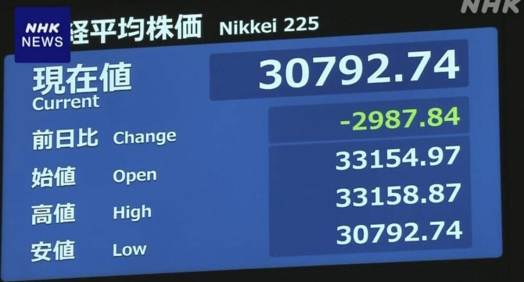 【速報中】株価 一時2900円以上急落 過去3番目の下落幅