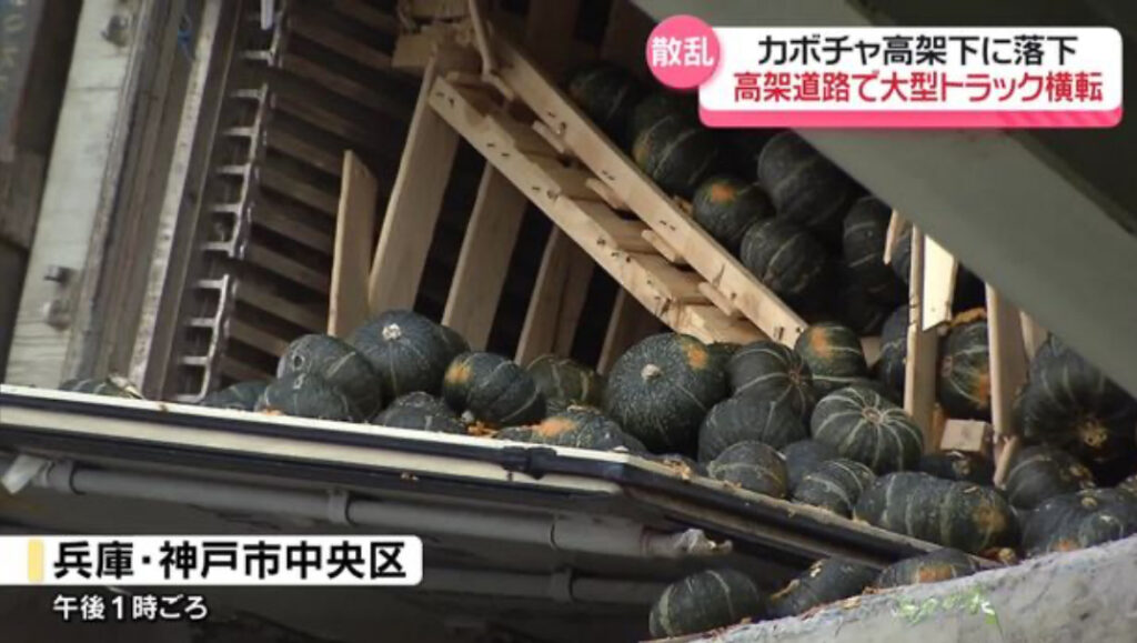 【兵庫】高架道路で大型トラック横転、カボチャが高架下に落下 神戸市