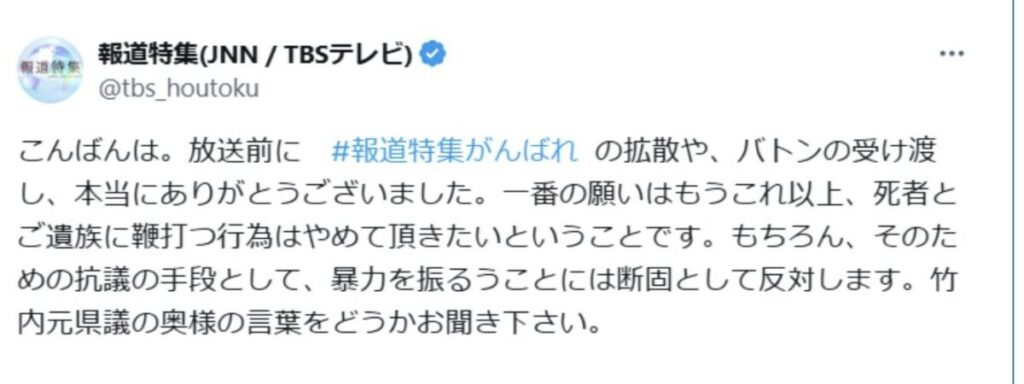 TBS『報道特集』、元兵庫県議への誹謗中傷に声明 「死者とご遺族に鞭打つ行為はやめて頂きたい」