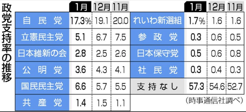 1: お断り ★ 2025/01/16(木) 20:52:02.43 ID:ZinLeps49 画像 1月 12月 11月 自民 17.3 19.1 20.0 立憲 5.1 6.7 7.5 維新 2.8 2.5 2.6 公明 3.6 4.3 4.1 国民 6.6 5.7 5.5 共産 1.4 1.5 1.1 れいわ 1.7 1.6 1... -
