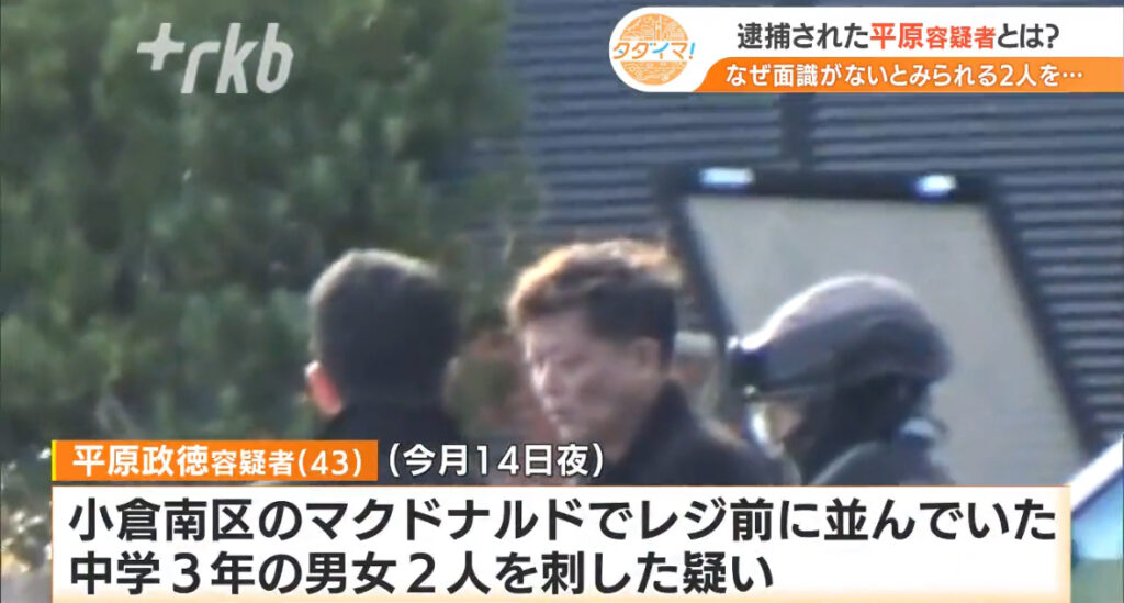 1: nita ★ 2024/12/19(木) 16:40:28.02 ID:+OWHoGhQ9 12/19(木) 16:27配信 RKB毎日放送 北九州市で中学生2人が男に襲われ女子生徒1人が死亡した事件。 発生から6日目に43歳の男が男子生徒に対する殺人未遂容疑で逮捕されました。 どんな人物だったのでしょ... -