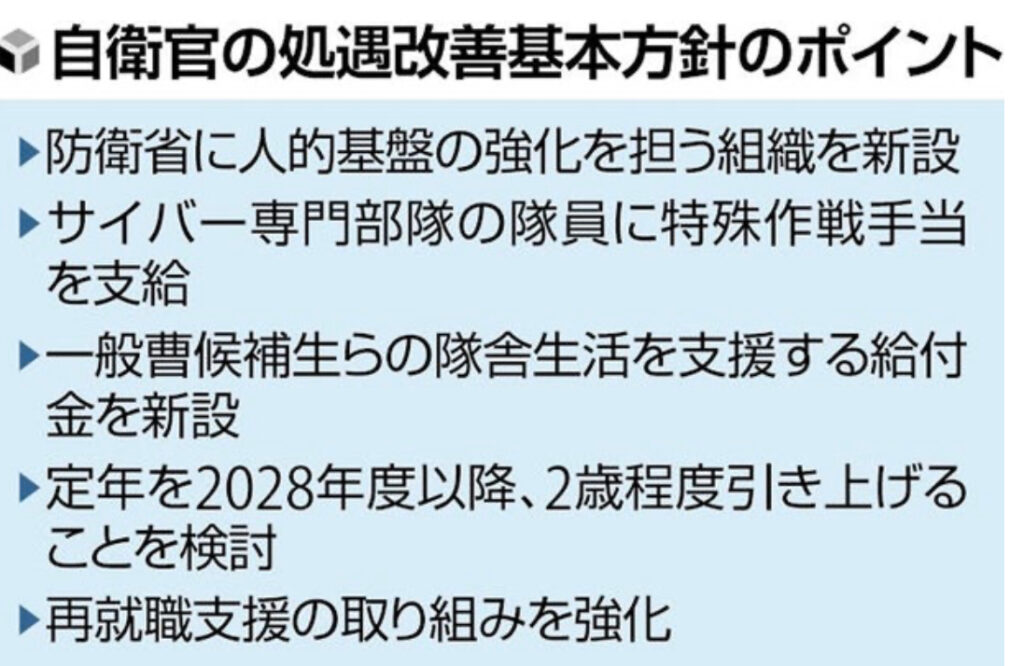 1: 香味焙煎 ★ 2024/12/17(火) 05:15:27.53 ID:tH3dqyan9 自衛官の処遇改善に向けて政府がまとめた基本方針の原案が16日、判明した。2025年度中に、防衛省内に人的基盤の強化を担う新たな組織を設置し、サイバー専門部隊の隊員らに特殊作戦手当を... -