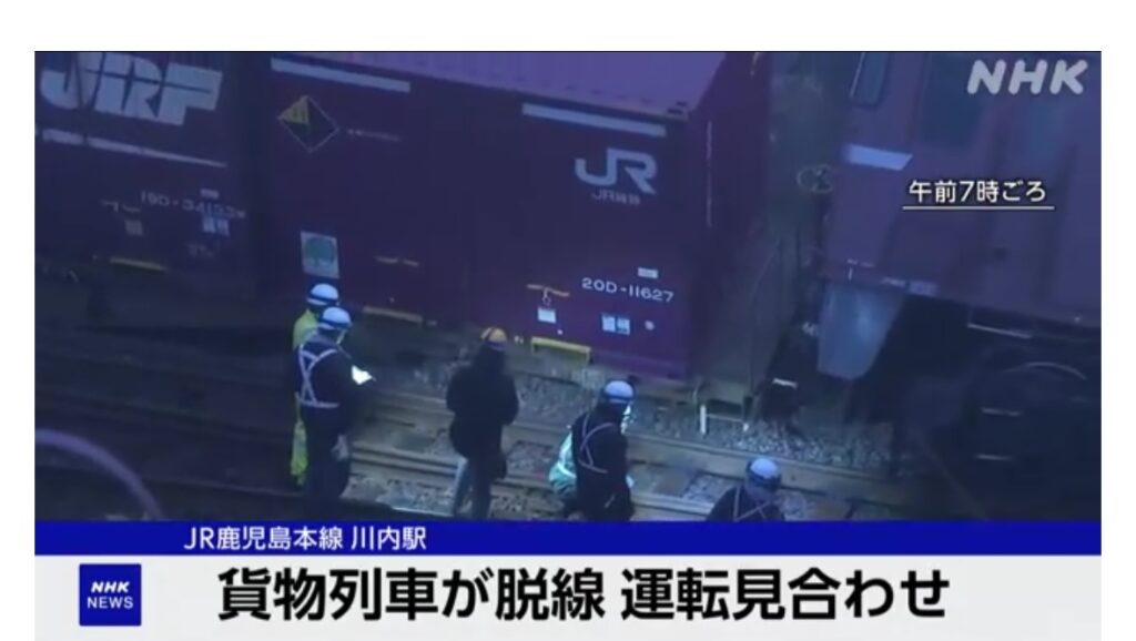 1: 名無しさん@涙目です。(庭) [US] 2024/12/12(木) 07:38:59.09 ID:AVnIsbFd0● BE:896590257-PLT(21003) sssp://img.5ch.net/ico/2-1.gif 鹿児島 JR川内駅で貨物列車が脱線 けが人なし 一部路線で不通 2024年12月12日 7時12分 https://www3.nhk.or.jp/ne... -