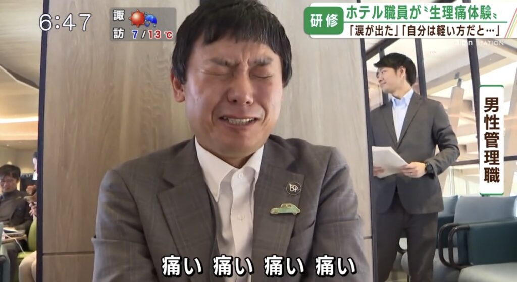 1: 名無しさん@涙目です。(やわらか銀行) [SE] 2024/11/27(水) 20:43:30.64 ID:O7JOk6Jl0 BE:478973293-2BP(1501) sssp://img.5ch.net/ico/imanouchi_2.gif 生理痛をホテルの男性管理職が体験 「全男性に経験してほしい」 研修会で新たな理解を深める【... -