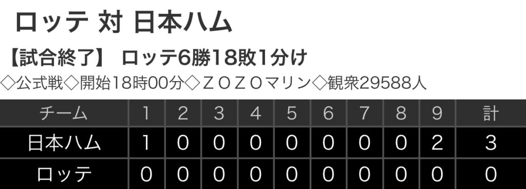 1: 鉄チーズ烏 ★ 2024/10/03(木) 20:49:13.42 ID:ZiQxx6n39 日本ハム 1 0 0 0 0 0 0 0 2|3 ロッテ. 0 0 0 0 0 0 0 0 0|0 【バッテリー】 (日)達、齋藤友、杉浦、山本拓、河野、田中正 - 伏見、田宮 (ロ)カイ... -