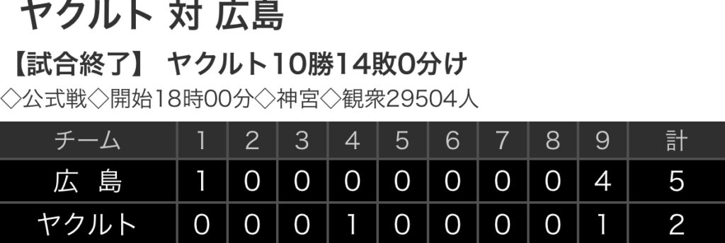 1: 鉄チーズ烏 ★ 2024/10/03(木) 21:05:06.80 ID:ZiQxx6n39 広島 1 0 0 0 0 0 0 0 4 |5 ヤクルト 0 0 0 1 0 0 0 0 1 |2 【バッテリー】 (広)大瀬良、中﨑、長谷部、島内、森浦 - 坂倉、石原 (ヤ)吉村、ロドリ... -