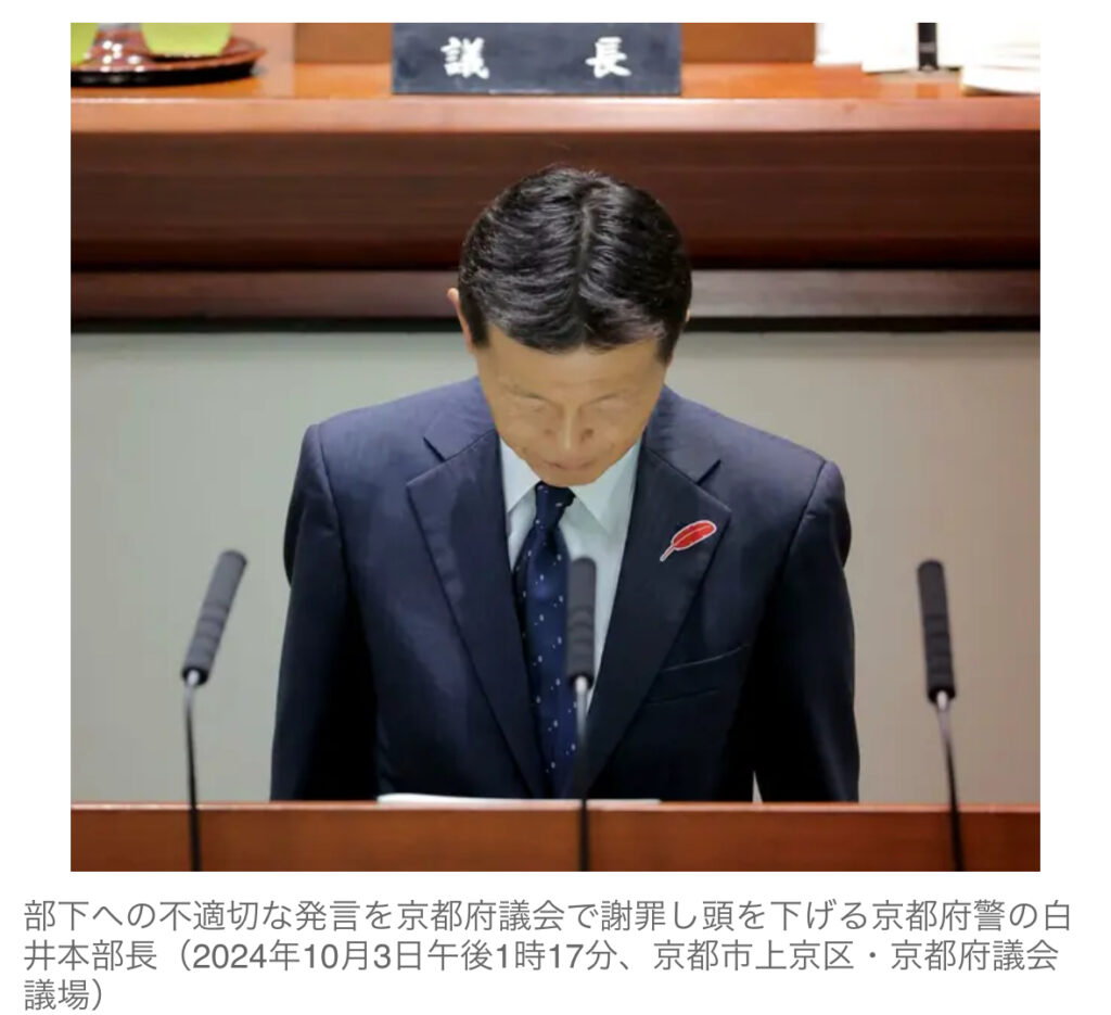 1: チュン太 ★ 2024/10/03(木) 14:48:20.23 ID:??? TID:chunta 京都府警の白井利明本部長(56)が業務中に部下の府警幹部に「殺すぞ」と発言していた問題で、白井本部長は3日、府議会本会議で、警察庁から同日午前、長官訓戒の処分を受け、14日付で長官官...