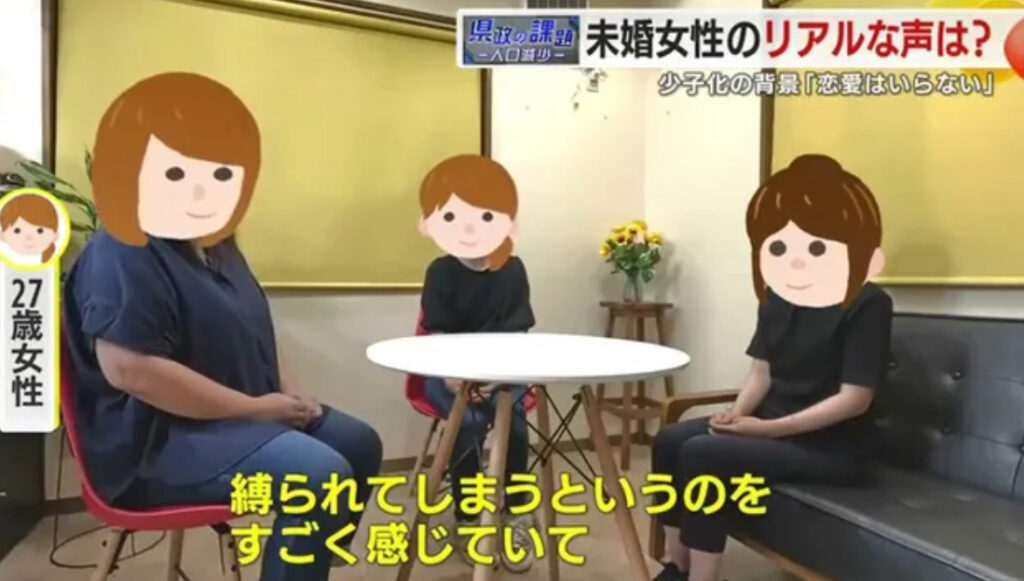 1: 首都圏の虎 ★ 2024/10/02(水) 20:06:03.92 ID:4GKzB37V9 女性1人が一生のうちに産む子供の数を示した合計特殊出生率。静岡県では過去最低を更新してしまった。背景には若者の未婚化や晩婚化がある。なぜ結婚を望まないのだろうか?30歳前後の未婚女性3人... -