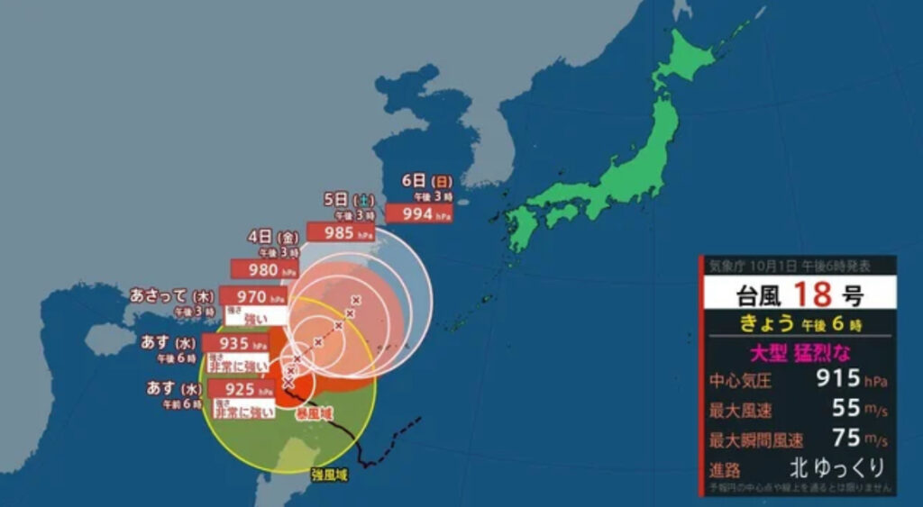 1: @シャチ ★ 警備員[Lv.24][苗] 2024/10/01(火) 21:11:33.64 ID:xYbQ8DUn9 気象庁が10月01日17時13分に発表した内容です。 大型で猛烈な台風第18号は、3日から5日頃にかけて沖縄地方に接近するおそれがあります。沖縄地方では、うねりを伴った高波に警戒... -
