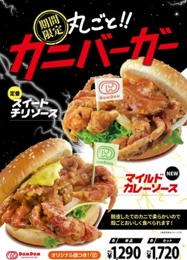 ドムドムバーガー名物、カニ一匹入った「丸ごと!!カニバーガー」カレー味も仲間入り! 1290円