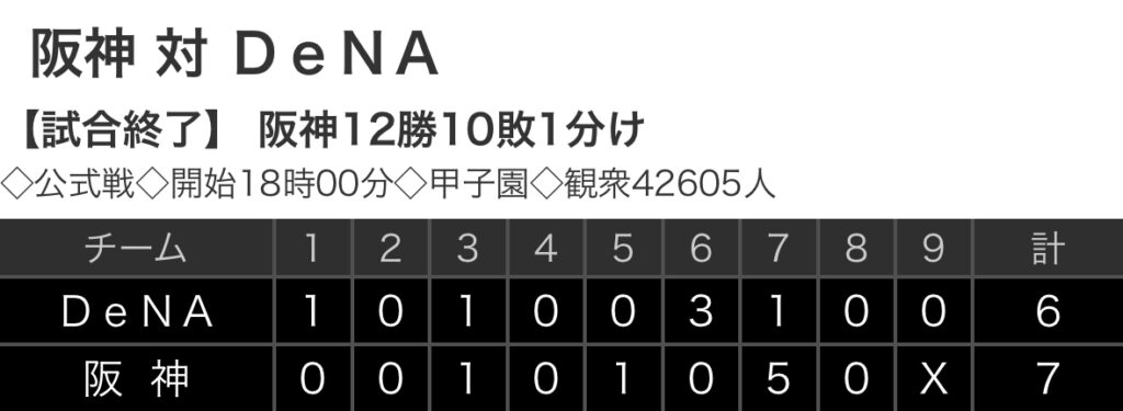 1: 鉄チーズ烏 ★ 2024/09/29(日) 21:24:52.30 ID:pK72XZpO9 DeNA 1 0 1 0 0 3 1 0 0 |6 阪神 0 0 1 0 1 0 5 0 x |7 【バッテリー】 (De)東、中川颯、ディアス、伊勢、ウェンデルケン - 伊藤 (阪) 才木、... -
