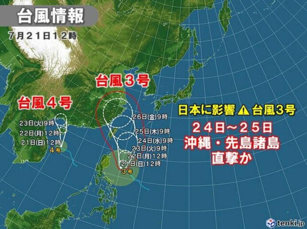 1: @シャチ ★ 警備員[Lv.6] 2024/07/22(月) 11:25:13.13 ID:Hl9d1R7o9 今日21日(日)12時、南海で台風4号が発生しました。昨日20日(土)発生した台風3号に続き、現在、ダブル台風が発生中です。要警戒なのは、フィリピンの東の台風3号。週明け24日(水)~25... -
