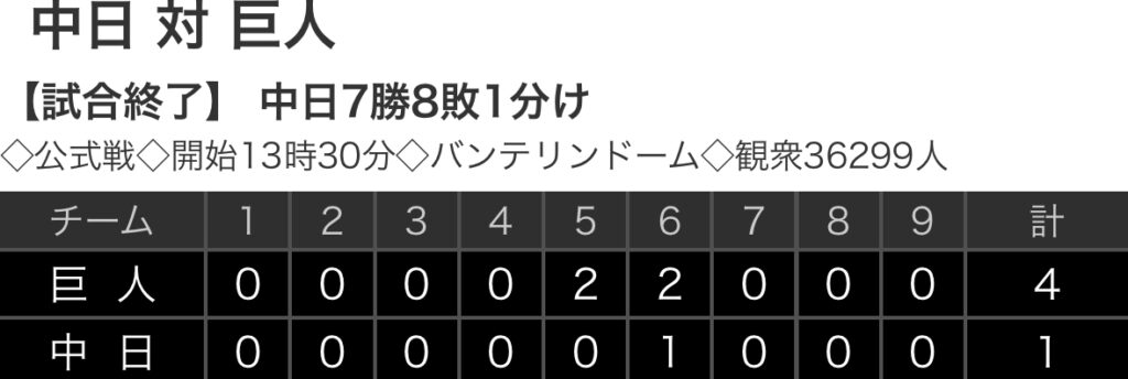 1: 鉄チーズ烏 ★ 2024/07/21(日) 16:31:20.67 ID:lwjpC80e9 巨人 0 0 0 0 2 2 0 0 0 |4 中日 0 0 0 0 0 1 0 0 0 |1 【バッテリー】 (巨)菅野、ケラー、高梨、バルドナード、船迫 - 小林 (中)松葉、藤嶋、岩嵜、勝... -