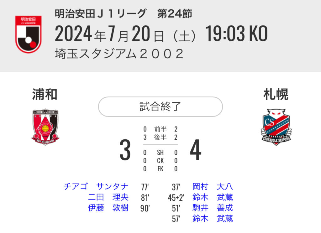 1: 久太郎 ★ 2024/07/20(土) 21:42:39.59 ID:QjF0PI2k9 浦和 3-4 札幌 [得点者] 37'岡村 大八 (札幌) 45+2'鈴木 武蔵 (札幌) 51'駒井 善成 (札幌) 57'鈴木 武蔵 (札幌) 77'チアゴ サンタナ(浦和) 81'二田 理央 ... -