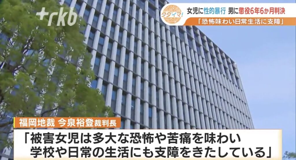 1: 窓際被告 ★ 2024/07/19(金) 23:16:49.30 ID:3O6Pcw0M9 登校中の12歳女児に性的暴◯ 「多大な恐怖や苦痛を味わい日常の生活にも支障」20歳の男に懲役6年6か月の判決去年11月、福岡県内の路上で、登校中の当時12歳の女子児童に性的暴◯を加えた男の裁判で... -