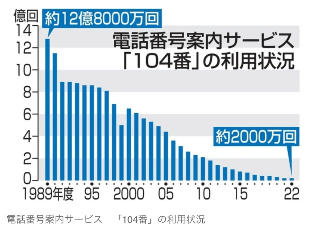 1: KOU ★ 2024/07/18(木) 22:43:01.58 ID:??? TID:kougou NTT東日本とNTT西日本が、局番なしの「104番」でつながる電話番号案内サービスを終了する方針を固めたことが18日、分かった。スマートフォンやインターネットの普及で電話番号を知る手段が増え、利... -