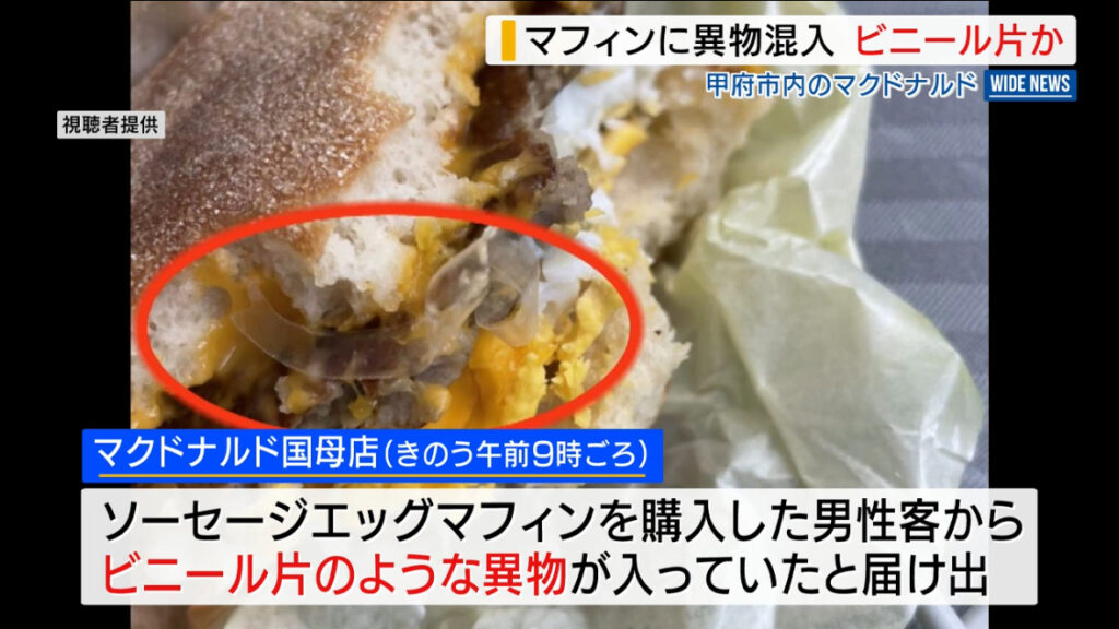 1: レノン ★ 2024/07/17(水) 19:32:22.51 ID:??? TID:lennon 甲府市のマクドナルドの店舗で客が購入したソーセージエッグマフィンにビニール片のようなものが混入していたことが17日、分かりました。 日本マクドナルドなどによりますと、16日午前9時ごろ、... -