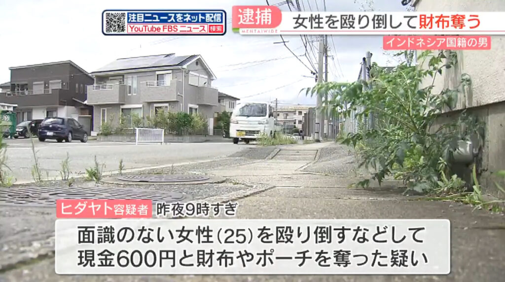 1: 煮卵 ★ 2024/07/16(火) 19:39:12.12 ID:i4u9h5Dm9 福岡市早良区の路上で面識のない女性を殴り倒し、踏みつけるなどしてケガをさせ、財布を奪ったとして、インドネシア国籍の28歳の男が16日、緊急逮捕されました。 強盗傷害の疑いで緊急逮捕されたのは、... -