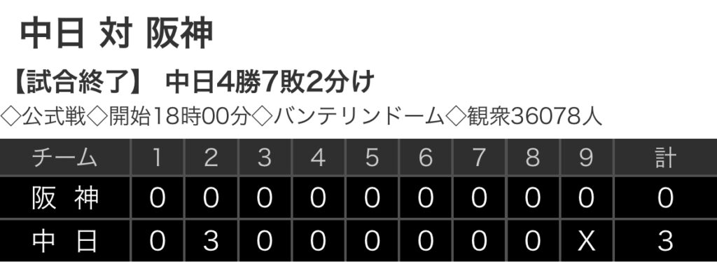 1: 鉄チーズ烏 ★ 2024/07/12(金) 20:18:23.92 ID:ZU5c5uW29 阪神 0 0 0 0 0 0 0 0 0 |0 中日 0 3 0 0 0 0 0 0 x |3 【バッテリー】 (阪)村上、及川 - 梅野 (中)高橋宏、マルティネス - 加藤匠 【本塁打】 (阪) ... -