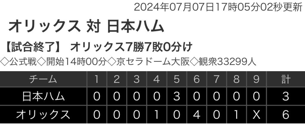 1: 鉄チーズ烏 ★ 2024/07/07(日) 16:53:34.37 ID:zwqVENXu9 日本ハム 0 0 0 0 3 0 0 0 0|3 オリックス. 0 0 0 1 0 4 0 1 x|6 【バッテリー】 (日)伊藤、宮西、齋藤友、池田 - 田宮 (オ)エスピノーザ、古田島... -