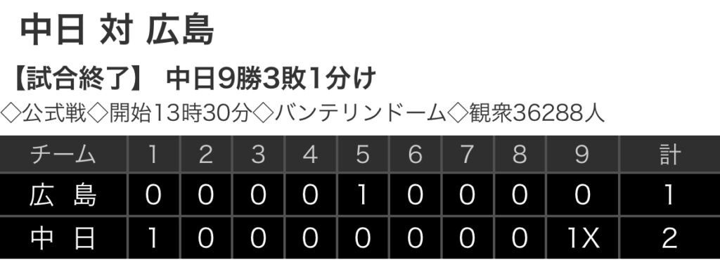 1: 鉄チーズ烏 ★ 2024/07/07(日) 15:54:53.50 ID:zwqVENXu9 広島 0 0 0 0 1 0 0 0 0 |1 中日 1 0 0 0 0 0 0 0 1x |2 【バッテリー】 (広)玉村、森浦、島内、栗林 - 石原 (中)松葉、清水、松山、マルティネス -... -