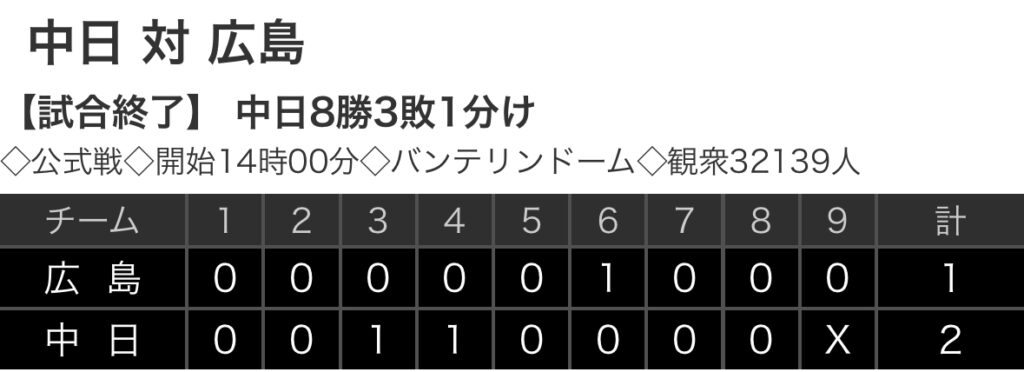 【野球】セ・リーグ D 2-1 C [7/6] 中日・梅津6回1失点 福永先制犠飛、板山1号HR カープ連敗9回同点のチャンスも…