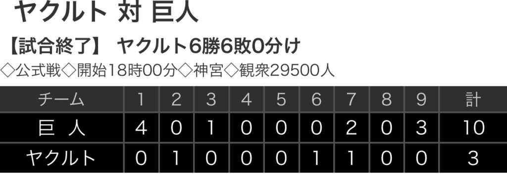 【野球】セ・リーグ S 3-10G [7/5] 巨人ヘルナンデス3安打1打点、岸田3安打6打点1HR、戸郷7回途中3失点 ヤクルト連敗