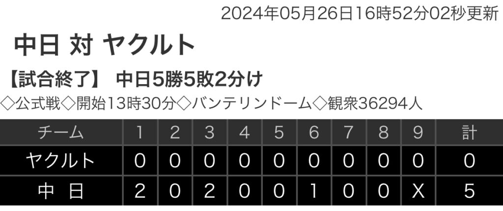 1: 鉄チーズ烏 ★ 2024/05/26(日) 16:42:49.24 ID:cjiUsPuP9 ヤクルト 0 0 0 0 0 0 0 0 0 |0 中日 2 0 2 0 0 1 0 0 x |5 【バッテリー】 (ヤ)松本健、長谷川、丸山翔、大西、星 - 中村、西田 (中)仲地、橋本、... -
