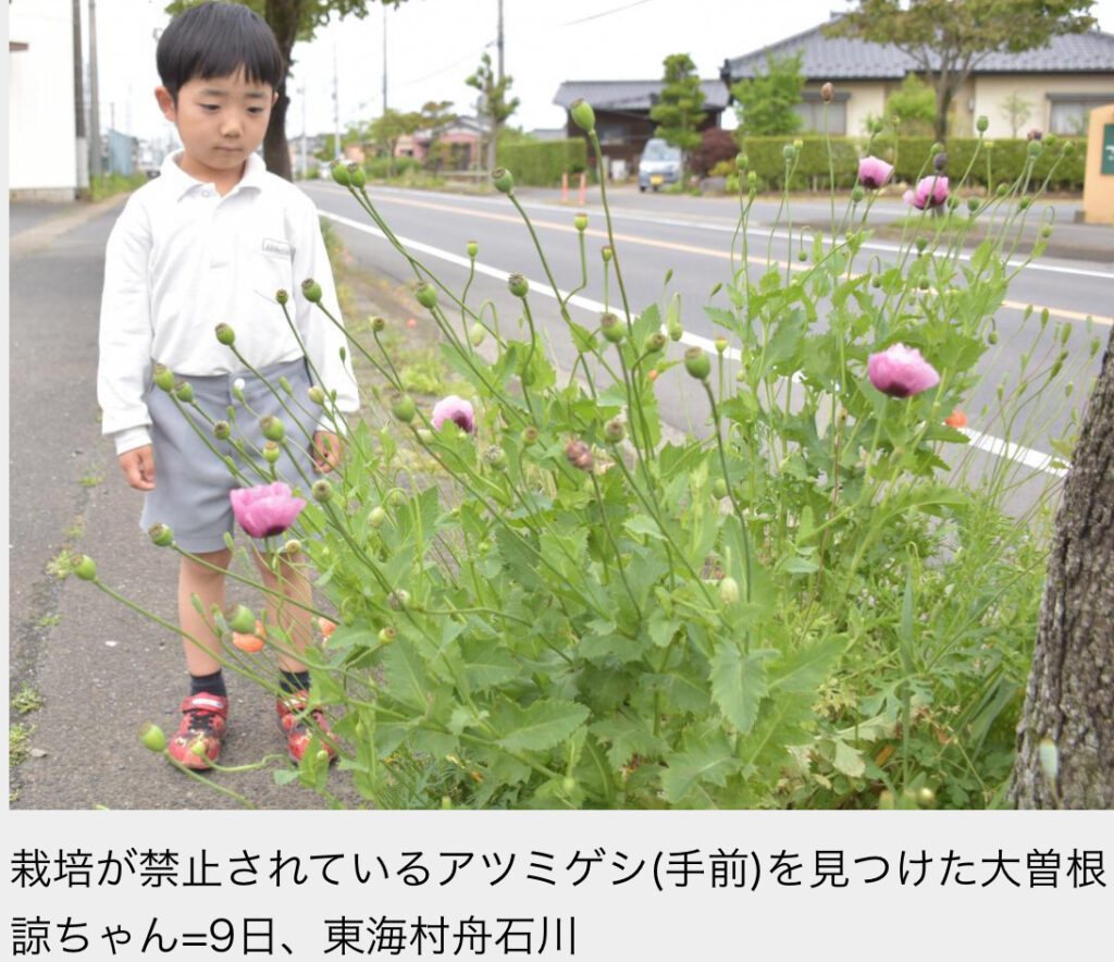 1: @おっさん友の会 ★ 警備員[Lv.11][新苗] 2024/05/14(火) 11:30:23.48 ID:y0jy93Y99 茨城県東海村舟石川の村道沿いに「あへん法」で栽培が禁止されているアツミゲシが咲いているのを、同村の保育園児、大曽根諒ちゃん(5)が見つけた。 草花が大好きで、... -