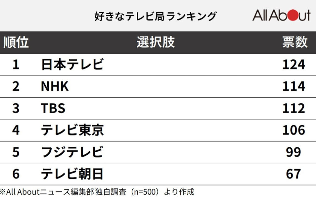 「好きなテレビ局」ランキング! 2位「NHK」を抑えた1位は? 最下位はテレビ朝日
