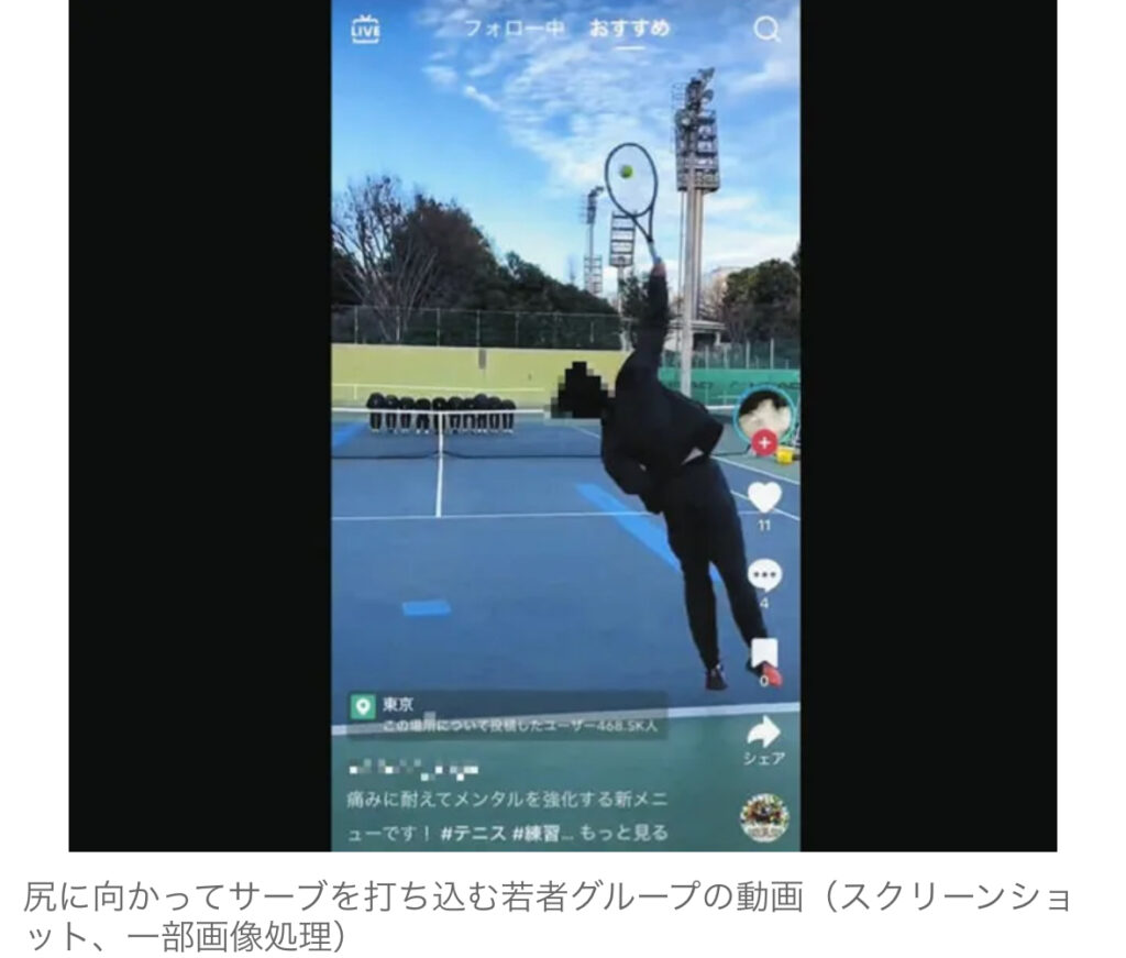 1: @おっさん友の会 ★ 警備員[Lv.0][新芽] 2024/05/11(土) 18:48:28.23 ID:7AmmJmkp9 学生風の若者グループがテニスボールを尻に向かって打ち込む悪ノリ動画がSNSで拡散され、批判が殺到している。 物議を醸している動画はTikTokに投稿され、4... -