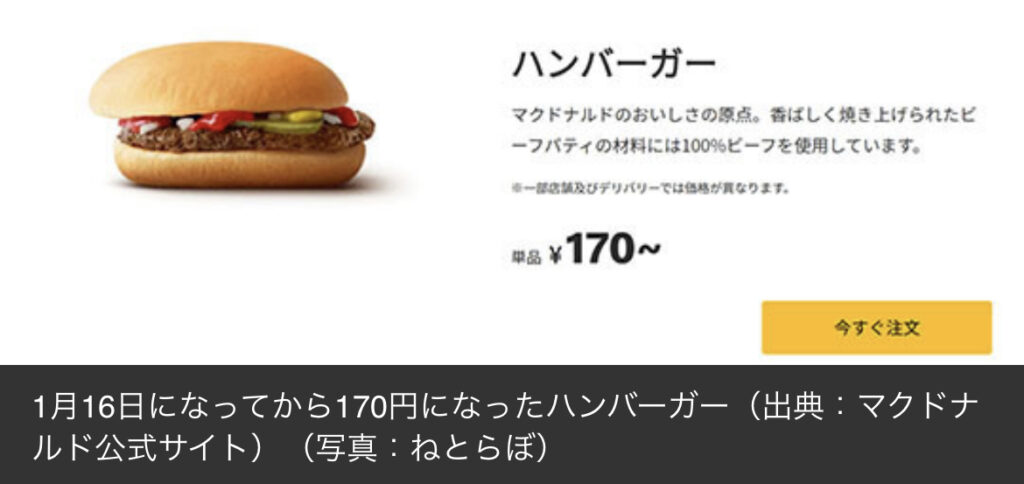 1: 愛の戦士 ★ 2023/01/27(金) 18:06:13.55 ID:7r2zvC3R9 ねとらぼ 1/27(金) 12:00 1月16日になってから170円になったハンバーガー(出典:マクドナルド公式サイト) 日本マクドナルドは、2023年1月16日から全体の約8割の品目の店頭価格改定を実施。SNSで... -