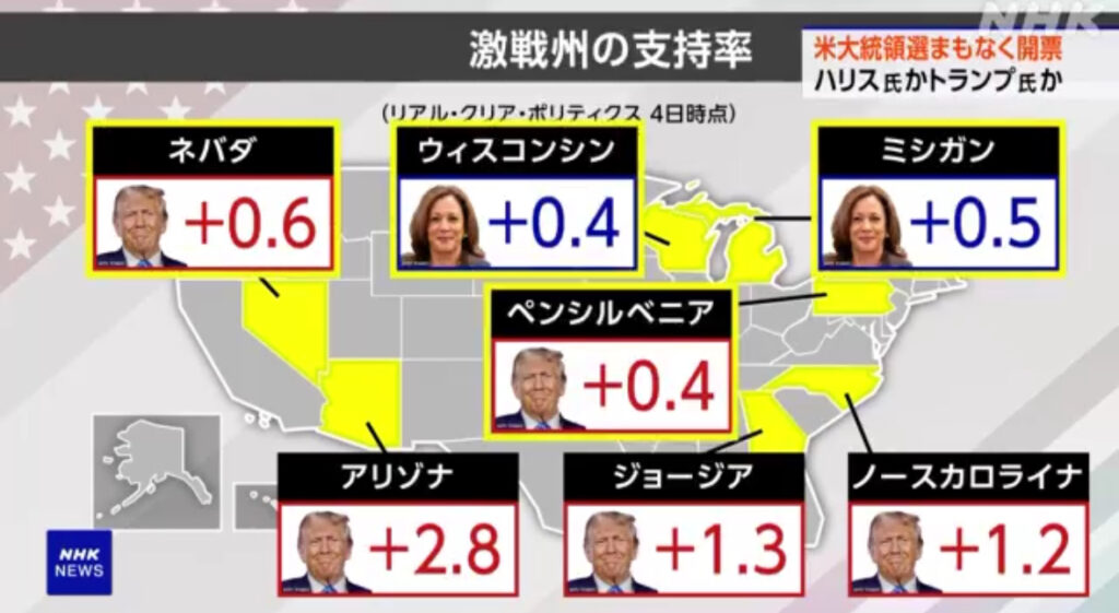 1: 首都圏の虎 ★ 2024/11/06(水) 08:13:42.30 ID:SHRog12m9 アメリカ大統領選挙は一部の州で開票が始まりました。 アメリカ史上初の女性の大統領を目指すハリス氏と、返り咲きをねらうトランプ氏のどちらを有権者が選ぶのか、その判断に世界中の目が注がれ... -