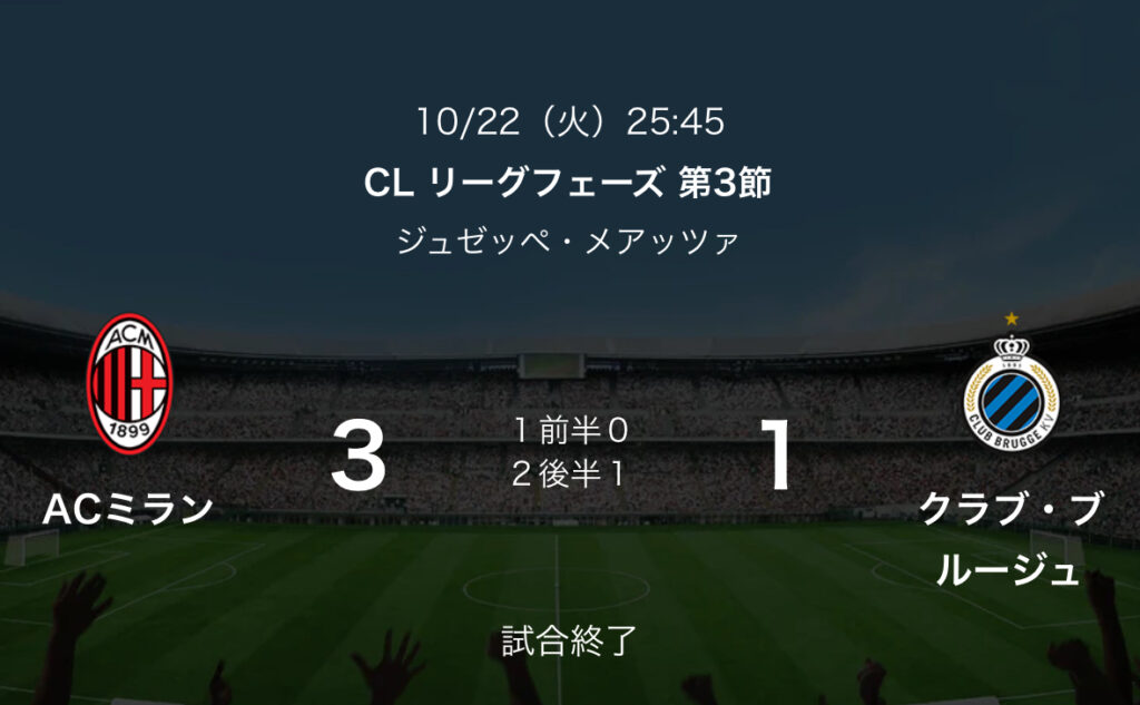 1: 久太郎 ★ 2024/10/23(水) 05:59:34.01 ID:oNDcIBRP9 ミラン 3-1 クラブ・ブルージュ [得点者] クリスティアン・プリシッチ(前半34分)ミラン カイリアニ・サブ (後半06分)クラブ・ブルージュ タイアニ・ラインデルス (後半16分)...