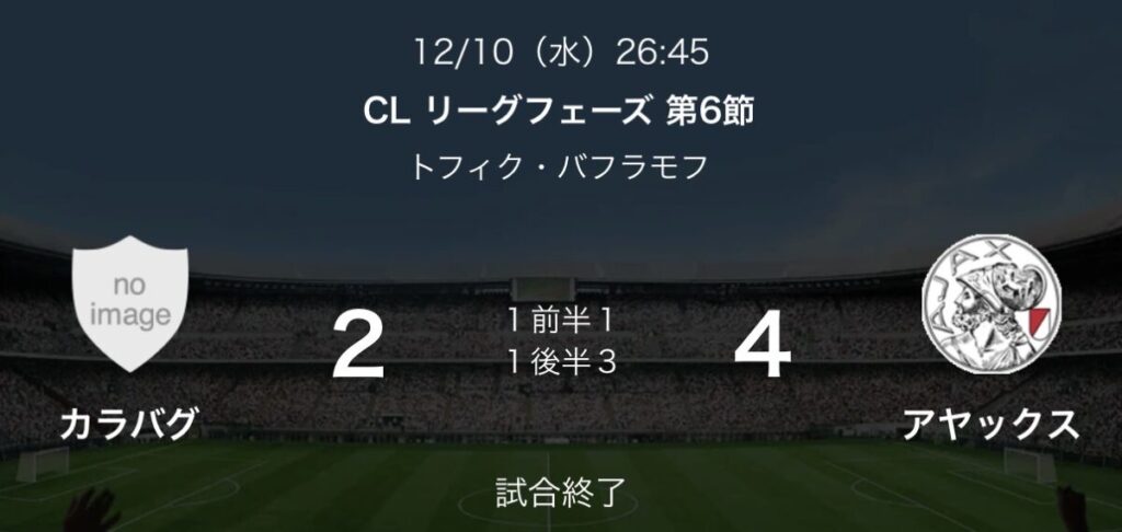 1: 久太郎 ★ 2025/12/11(木) 06:58:36.81 ID:kseU/Oxv9 カラバフ 2-4 アヤックス [得点者] カミロ・ドゥラン (前半10分)カラバフ カスパー・ドルベリ(前半39分)アヤックス マテウス・シウバ (後半02分)カラバフ オスカル・グロフ (後半34分... -
