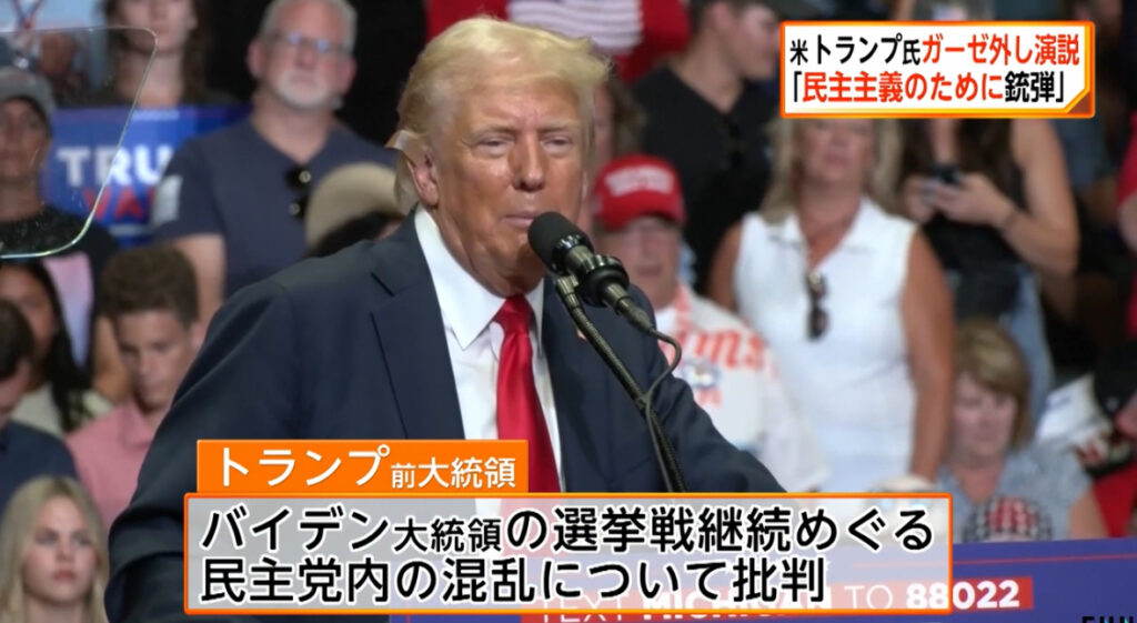 1: ごまカンパチ ★ 2024/07/21(日) 14:03:50.35 ID:en/ZRvHB9 https://news.yahoo.co.jp/articles/5b236dac7b8351476e7a95b64e22016b43eb579d アメリカのトランプ前大統領は7月20日、暗殺未遂事件後、初めて選挙集会で演説し、「民主主義のために銃弾を...