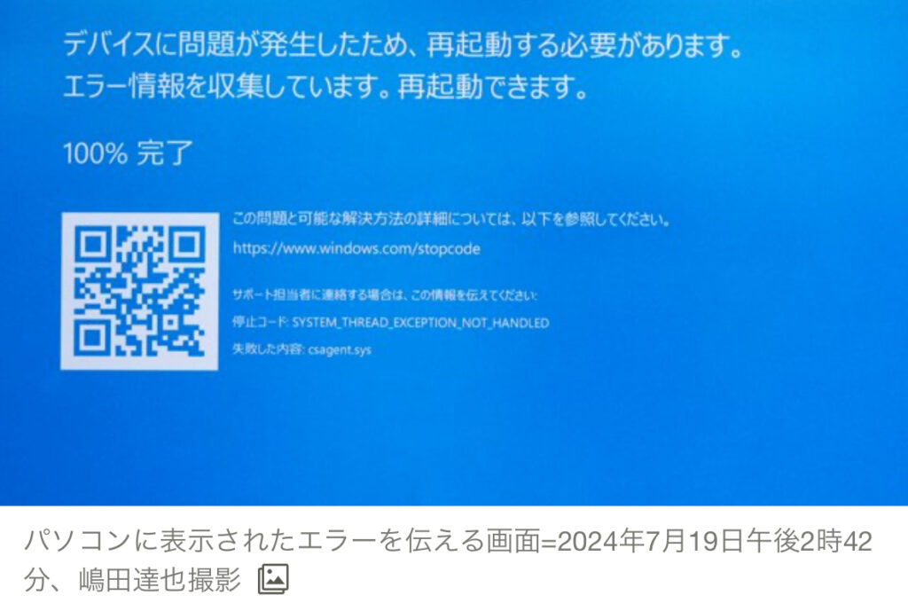 1: 影のたけし軍団 ★ 2024/07/19(金) 18:47:37.60 ID:??? TID:gundan ウィンドウズパソコンが19日午後1時半ごろから相次ぎ異常停止している。米国のセキュリティー企業「クラウドストライク」日本法人によると、同社のソフトを導入していたパソコンで発生... -